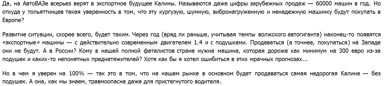 Rost писал(а):Дело в том что сам подход к тестированию порочен. Машины проверяются на столкновение с препятствием на малой скорости (кажется 64км/ч). это столкновение в лоб двух машин едущих со скоростью 32км/ч каждая.. вы представляете себе такое в реальных условиях?