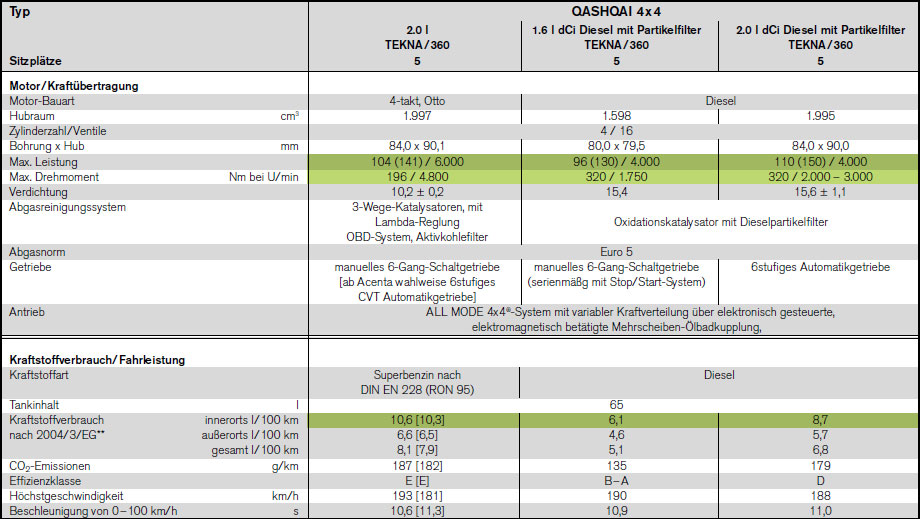 В Европе Кашкай продается не только с устаревшим 2.0 дизелем,но и новейшем турбодизелем обьемом 1.6 с 300Н\м крутящего момента!Его для полуторатонного Кашкая с головой-хватит!Расход топлива-6.1 в городском цикле!!!!И это-с полным приводом и механикой!С передним вообще-5.8 литра(уточнил!)!