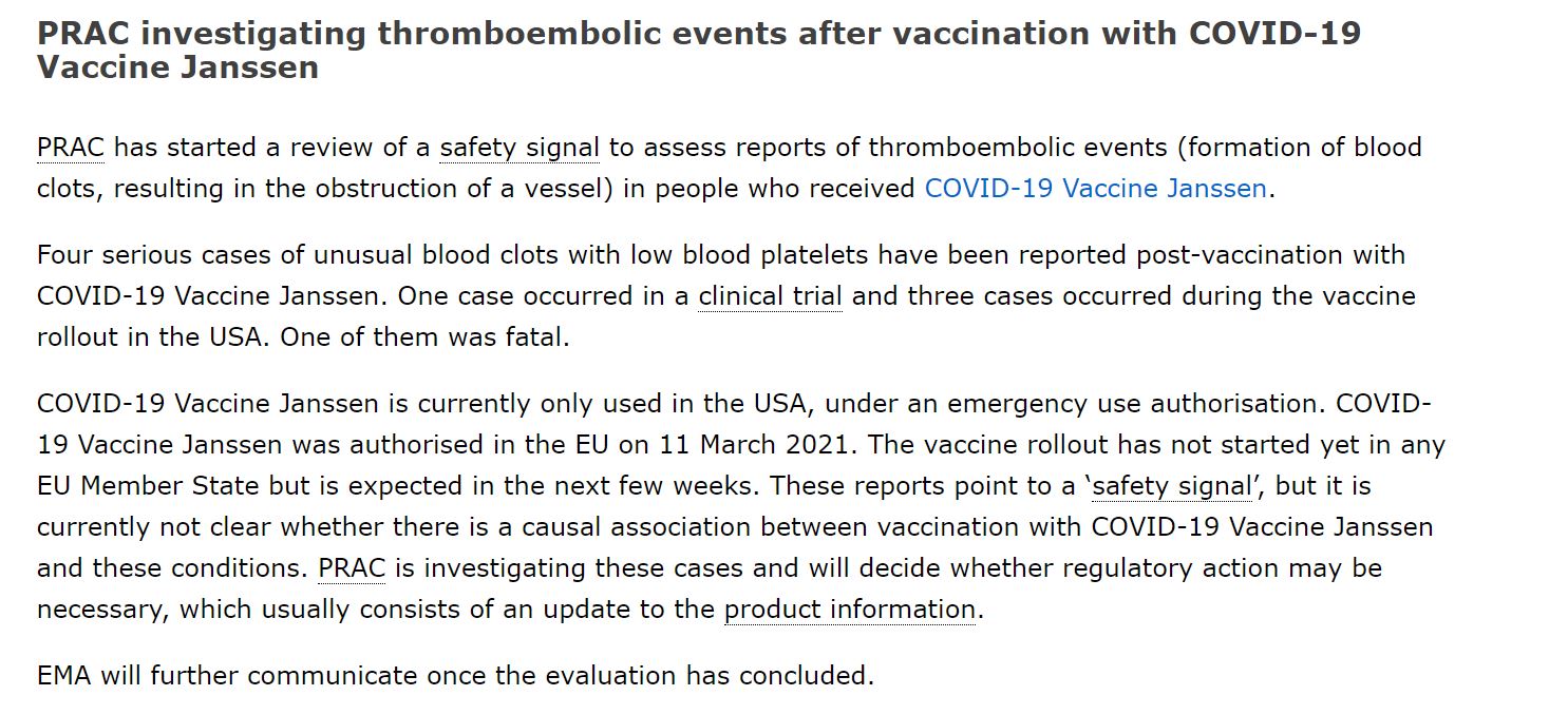 Вакцина COVID-19 Janssen в настоящее время используется только в США при наличии разрешения на применение в экстренных случаях. Вакцина COVID-19 Janssen была авторизована в ЕС 11 марта 2021 года. Внедрение вакцины еще не началось ни в одном государстве-члене ЕС, но ожидается в ближайшие несколько недель. Эти отчеты указывают на «сигнал безопасности», но в настоящее время неясно, существует ли причинно-следственная связь между вакцинацией COVID-19 Vaccine Janssen и этими состояниями. PRAC расследует эти случаи и решит, могут ли потребоваться регулирующие меры, которые обычно заключаются в обновлении информации о продукте.