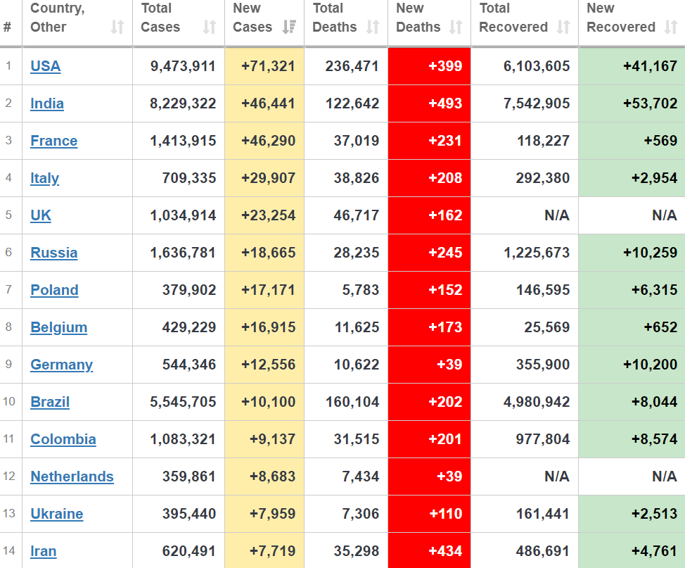 США возглавляют антирейтинг с 71 321 выявленным заболевшим за сутки. За ними – Индия (46 441), Франция (46 290), Италия (29 907) и Великобритания (23 254).