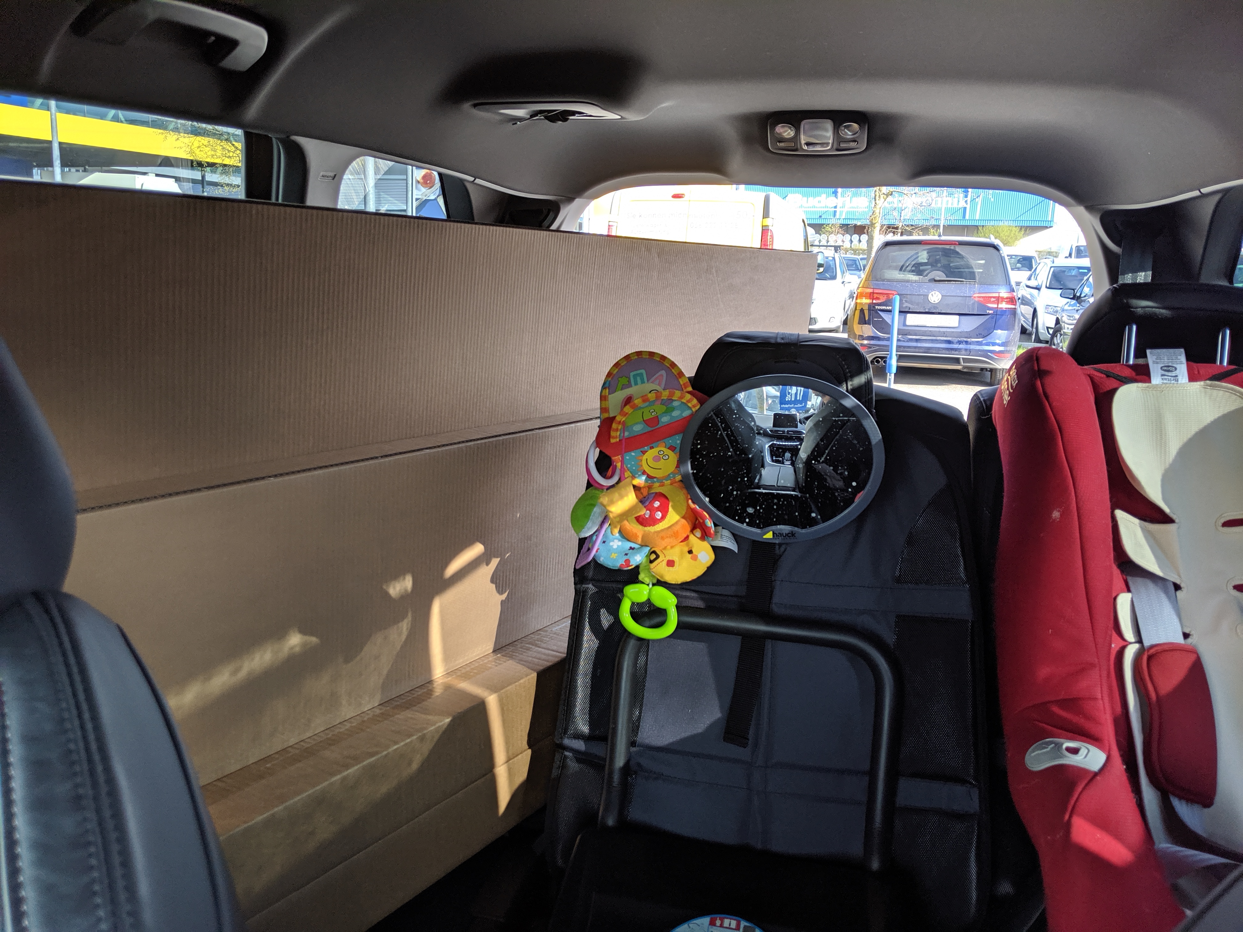 3 роздільні крісла в другому ряду це таки дуже зручно. І практично вертикальні багажні двері теж: ось такі коробки в машині, і не дивлячись на це в другому ряду без проблем стоїть два автокрісла і в першому ряду абсолютно комфортно сидять дорослі.