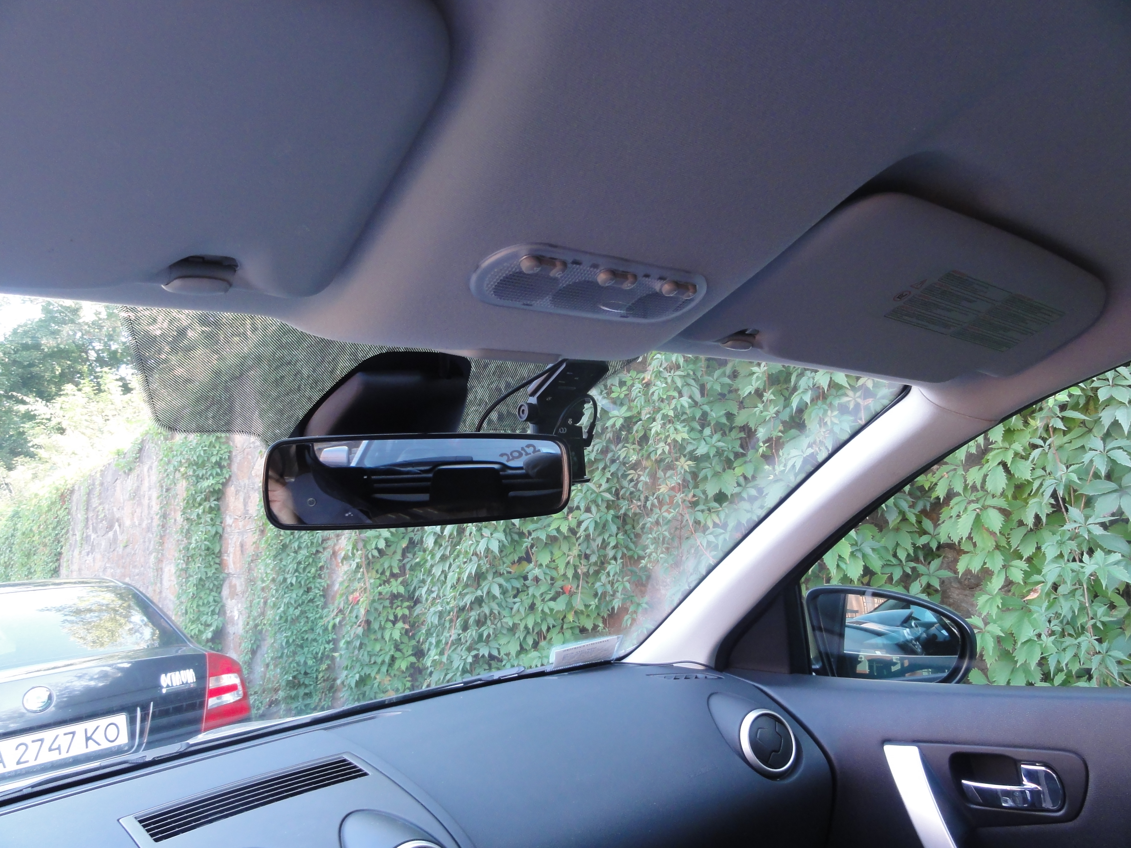 Ще раз уявив на фотці, якби дівайс був справа за дзеркалом (замість радар-детектора)... не знаю, наскільки трохи треба відвести голову, щоб побачити мигаючий світлодіод та екран за дзеркалом (при включенні екран допомагає впевнетись у коректному позіціонуванні об'єктиву, потім він вимикається через кілька секунд. Мігання світлодіода означає, що запис йде як треба і дівайс не вісить).