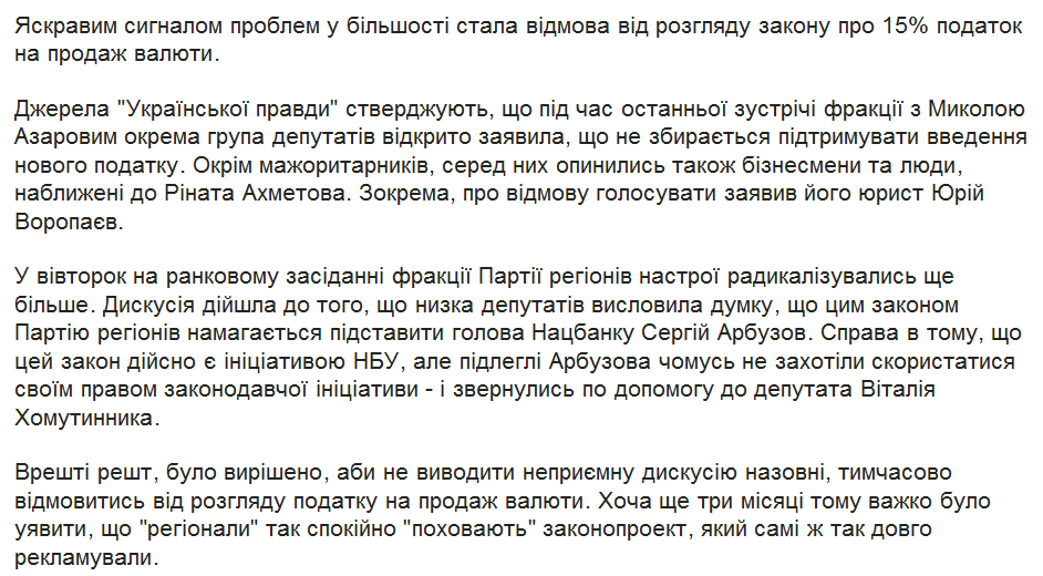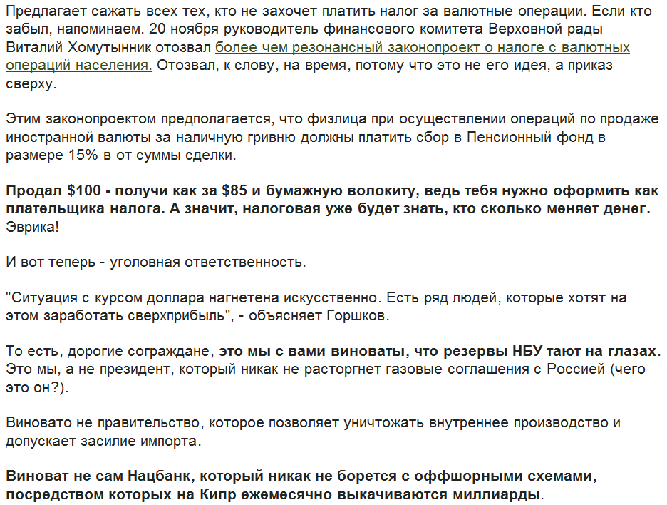 oreh писал(а):Верховная Рада Украины отложила на неопределенный срок рассмотрение законопроекта о введении 15% налога с продажи валюты.