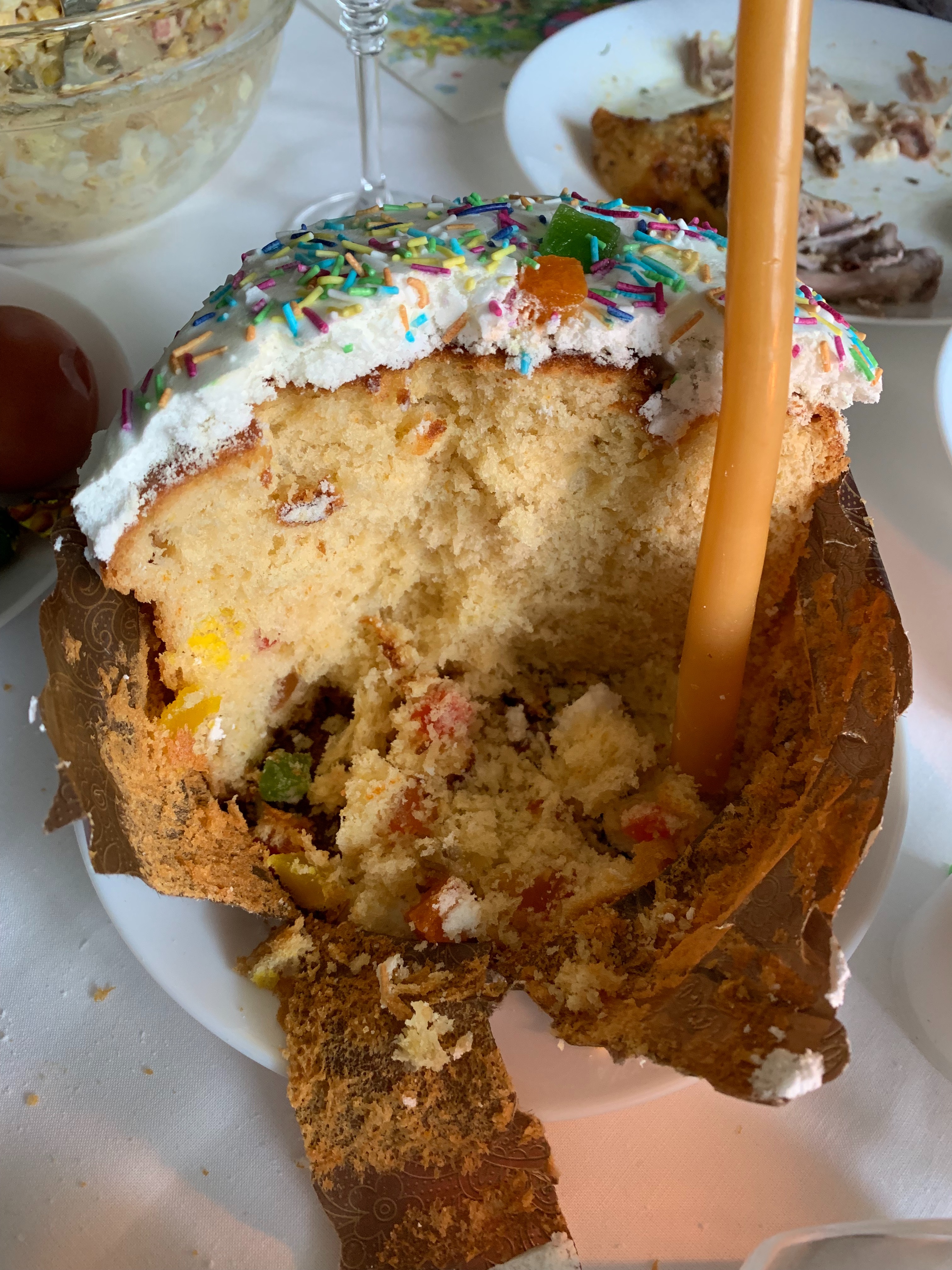 Sysopaty не пинати, бо хочу трохи позизуватися. Дружина вперше у житті пекла паски. Вивчила з півсотні рецептів, обрала якийсь відродженнтй 200-річний та зробила. Із цукатами, ням-ням. Не встиг за дітьми навіть цілу зфоткати.