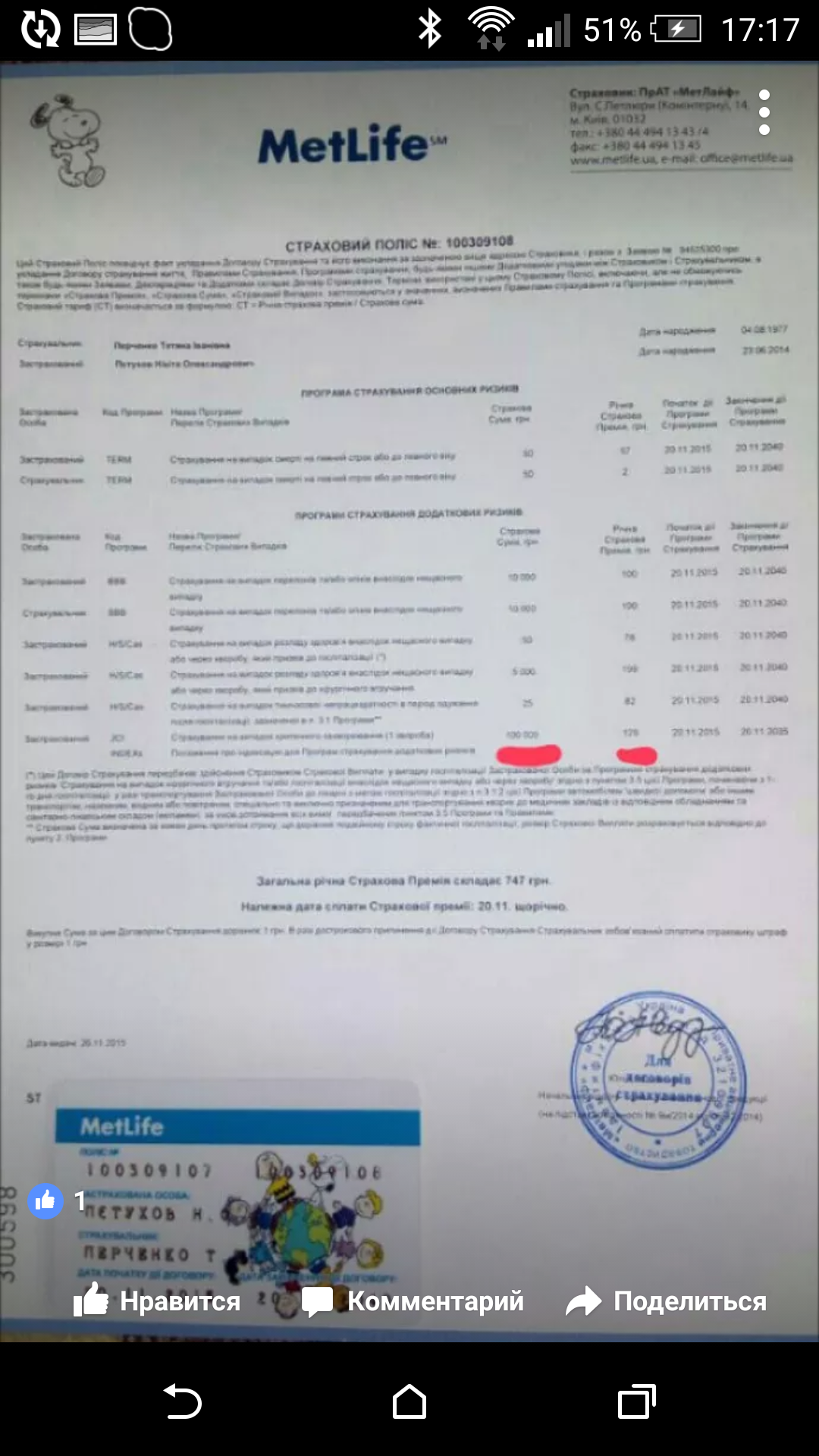 Выплата по детской программе Юниор Капитал за 1 - но критическое заболевание 100 000грн и 1700грн за пару дней стационара, в которой застрахован мой сын Петухов Никита, а я страхователь, тоисть плательщик.