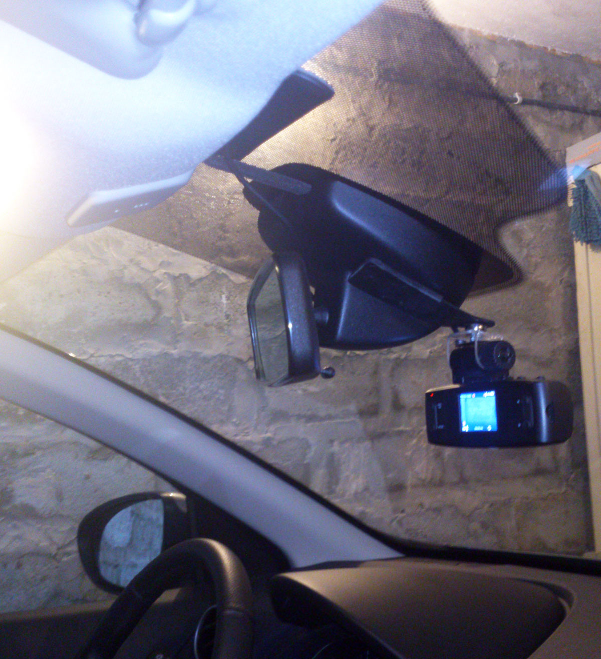 достаточно хорошо заметно т.к. тонировки в верхней части стекла у меня нет. Но надеюсь привлекательность регистратора без крепления которое можно легко украсть для злоумышленников падает. С пассажирской стороны так:
