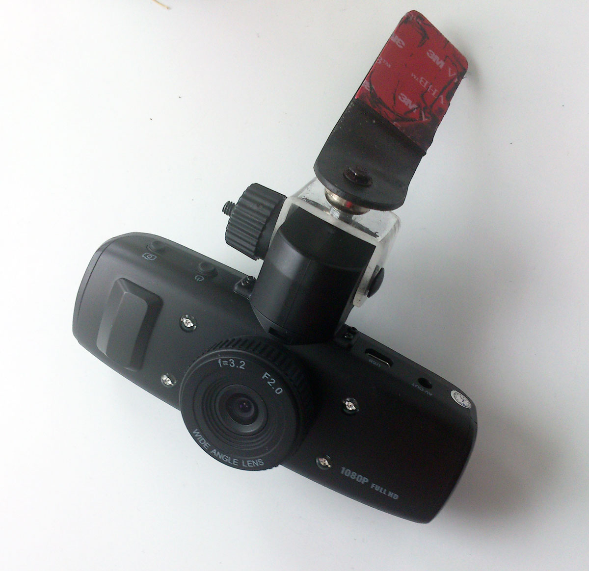 Изначально хотел совсем снять шарнир-набалдашник в верхней части регистратора, но там оказалась антенна GPS, поэтому пришлось оставить. Ну да ладно, зато регулировка вверх-вниз осталась. Итого снаружи это выглядит так: