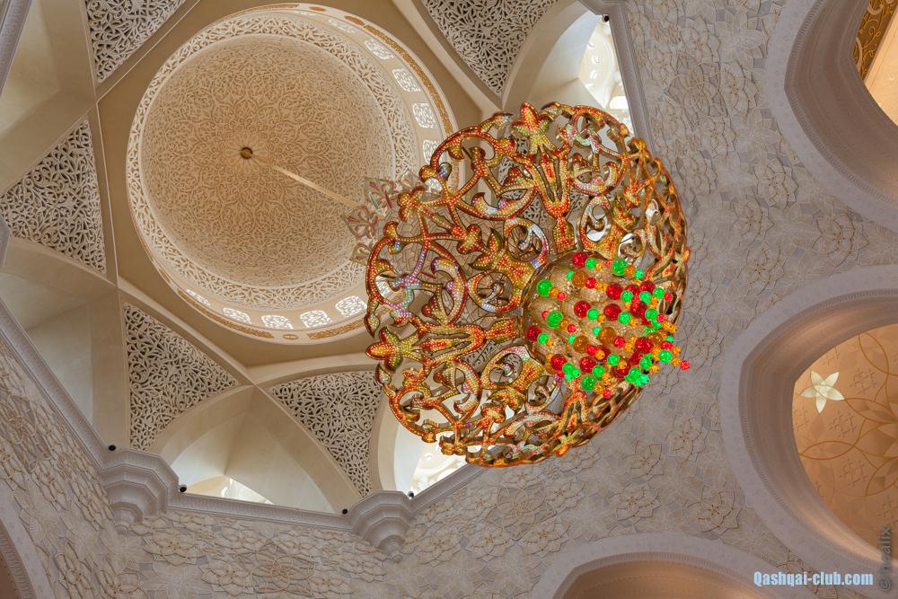 Самая большая в мире люстра в мечети. А до недавнего времени (2010) самая большая в мире люстра вообще. 12 тонн позолоченных (40 кг 24-каратного золота) нержавейки и латуни, усеянных кристаллами Сваровски. Рядом висят две 8-митонные сестрички. В четырёх фойе люстрочки от 2-х тонн и меньше.