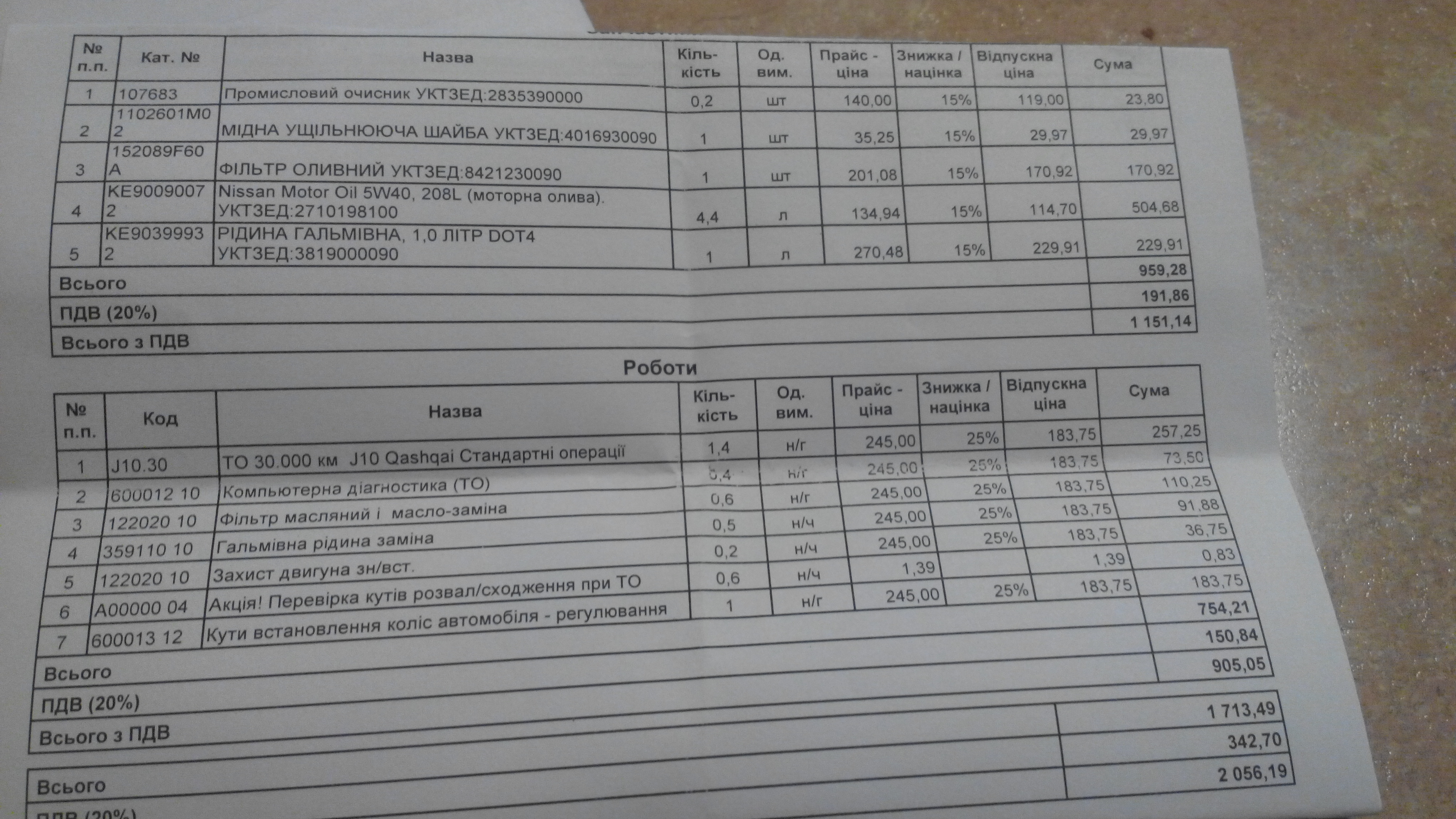 Смотрите пункт 1 в разделе работы. ТО 30 000. У вас не то 30 000. У вас ТО 2 года. Это две большие разницы. Я же вам говорил читайте внимательно. Вот они вас и обманули на 257 грн. плюс НДС. Потом компьютерна диагностика ? Она не входит в стандартные операции ТО 30 000? То же развод. После проведения "акционного" осмотра развала схода , они вам распечатку дали, что у вас есть проблемы? Если нет, то же развод. После каждой смены резины развал делать необязательно. Про гарантию за свечи это вообще жесть. Я бы в Ниссан украина настрочил письмо с жалобой. У вас пробег 16 000, какие свечи?