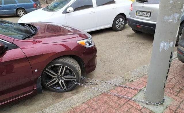 БЕЗПЕКА ПО-УКРАЇНСЬКИ: У СТОЛИЦІ ВОДІЙ ПРИСТЕБНУВ ВЛАСНЕ АВТО ДО СТОВПА 30 ГРУД. 2020 Р., 19:35: Водій автомобіля Honda Accord Sport припаркувався у недозволеному місці, а щоб убезпечити машину від евакуації прикував її ланцюгом до стовпа.