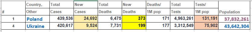 Интересно... При почти одинаковом количестве заболевших количество умерших тоже практически одинаково. То есть, пожем предположить, что ситуация в двух странах практически идентична. При этом охват тестами в Польше вдвое больше. Умножить на два Украину и отнять 15% - получим предполагаемое актуальное число забролевших. При почти таком же количестве выполненых тестов - число тяжёлых существенно меньше в Украине. Вот вам и подтверждение моих слов выше. И я бы добавил, что далеко не всех госпитализируют даже в тяжёлом состоянии. По опыту моих знакомых-друзей... Так что, маски, дезинфекция и мфтьё рук, и никуда (где есть контакт с людьми) не ходить без особой на то нужды. Берегите себя и своих близких.