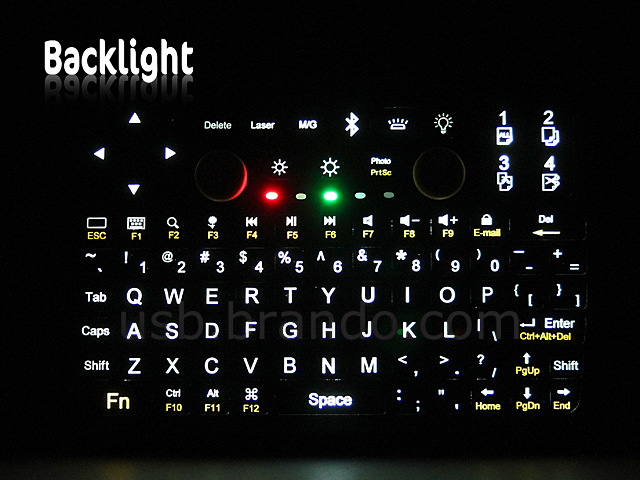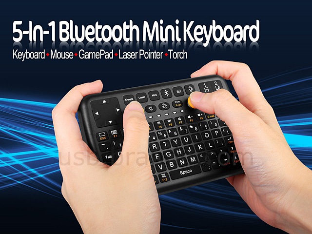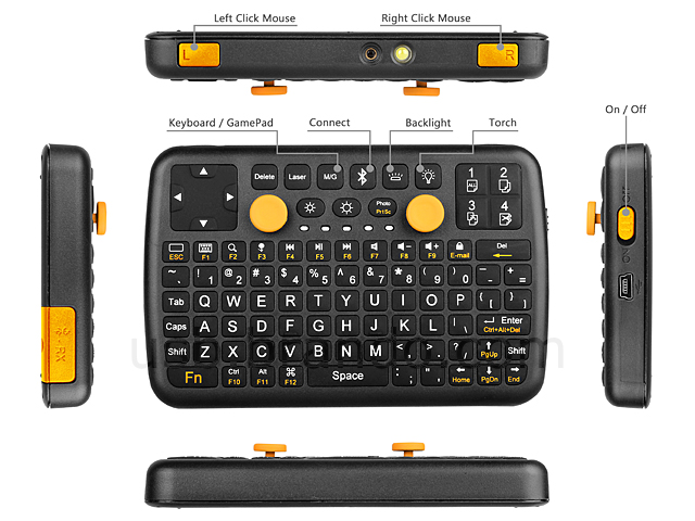 Устройство весом в 100 г, подключаемое по интерфейсу Bluetooth, может похвастать клавиатурой с 94 подсвечиваемыми кнопками, фонариком, лазером-указкой и джойстиками для управления курсором мышки или просто для игр. Если вдруг в компьютере нет bluetooth-приёмника, то это не беда – в гибриде спрятан свой приёмник, подключаемый по USB. Жалко, что автономность не указана, но это уже не так важно, учитывая цену в $46 (около 370 грн)