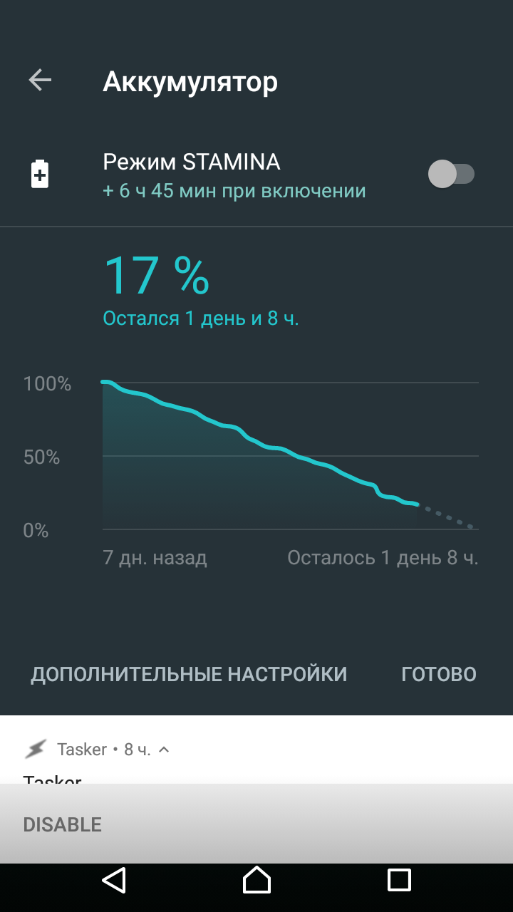 Прошла ровно неделя с дня последней зарядки. Пишу, чтоб задокументировать цикл. Стандартный режим работ, описан выше. Плюс сделал около 100 снимков и записал пару видео, общей длительностью где-то полчаса. Игрались с сыном, пробовали соневский встроенный timeshift-режим видеосьемки - 60 кадров в секунду, плюс обработка видео (жрет батарею, на графике скриншота отчетливо видно когда это происходило). Ну и всего понемногу. Звонков было много.