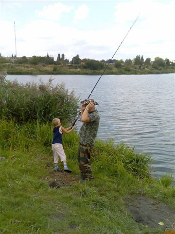 тягал сетку или бил рыбу електроудочкой (весь берег был в чешуе). Общие впечатления - всеже положительные: впервые поймал (увидел) окуней и пескарей, на спининг поймал хорошего карася (грамм на 300), потренировался в забрасывании разных снастей. После обеда пришли мои дети, с учетом того, что это было 1 сентября я их в педагогических