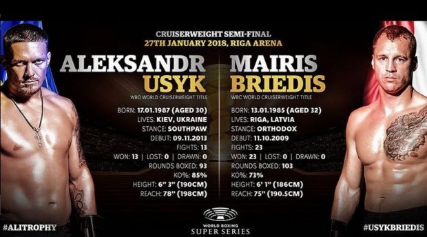 Олександр Усик, який є чемпіоном світу за версією WBO у першій важкій вазі, зустрічатиметься з латвійцем Майрісом Брієдісом на "Рига Арені" увечері 27 січня. Протистояння боксерів відбудеться у рамках півфіналу Всесвітньої боксерської суперсерії (WBSS).