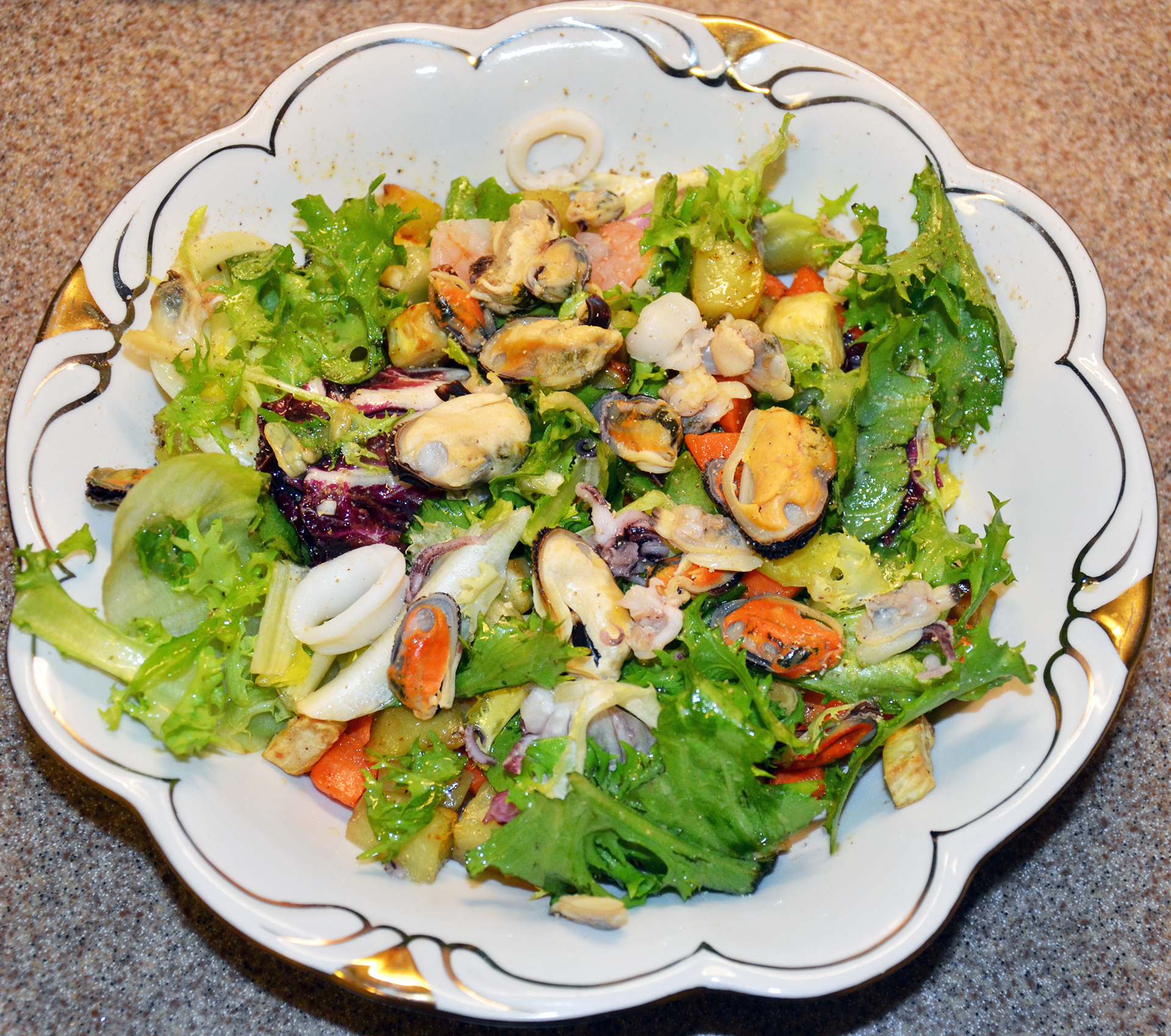 Готовим его часто. Если не под праздник, то по сути, как только видим в метро скидку на морепродукты, сразу берем и в большинстве случаев готовим этот салат. Фишка этого салата в том, что здесь среди прочих запекается один очень полезный овощ, который надо есть, но приготовить из него часто не получается. Имя этому овощу - сельдерей.