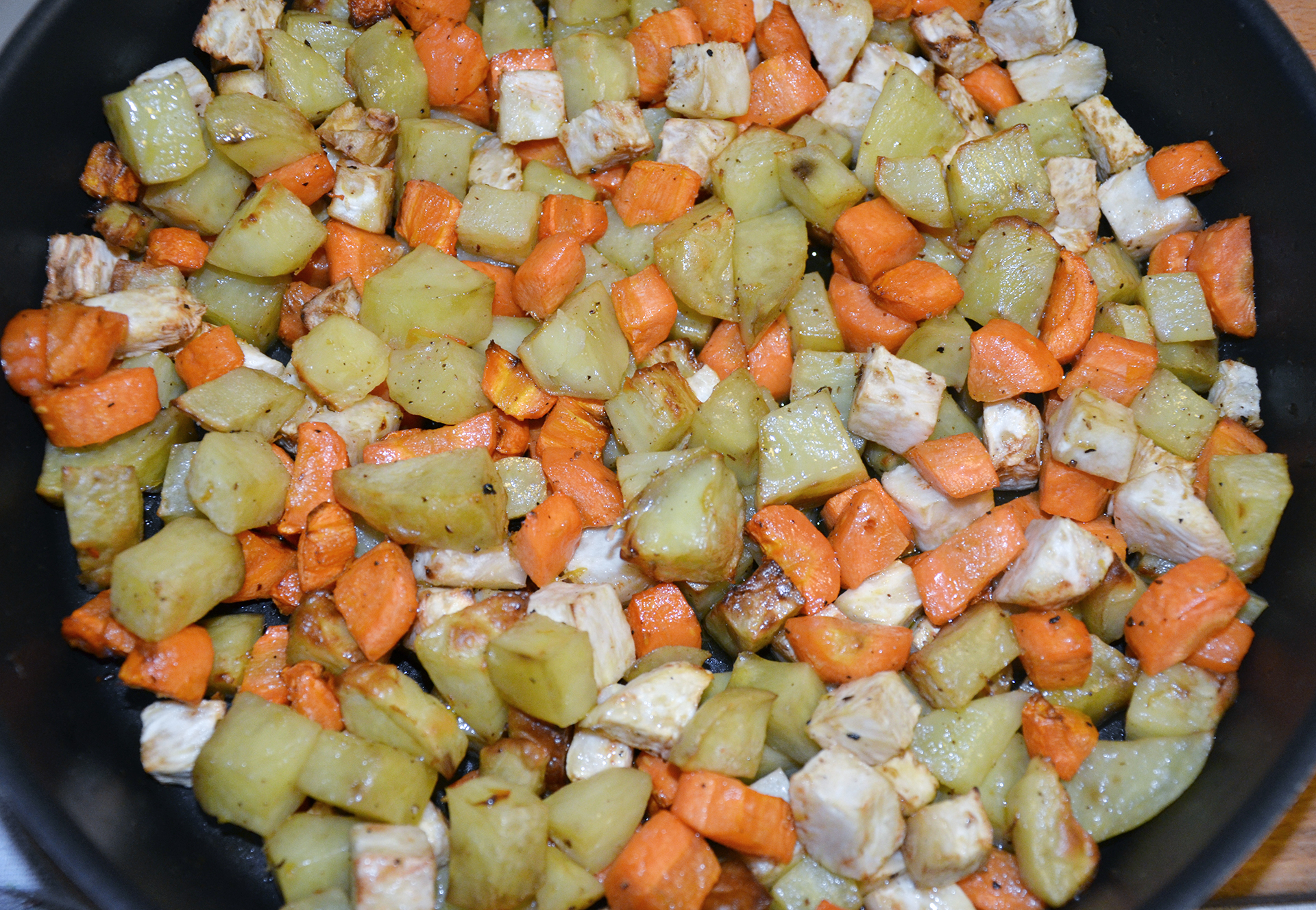 Приготовление Нарежьте кубиком морковь, корень сельдерея и картофель. Полейте хорошо оливковым маслом, приправьте солью, перцем и цедрой лимона. Положите рядом чеснок и запекайте при температуре 190 градусов 15 минут под фольгой. Затем достаньте чеснок, а остальное запекайте еще 15 минут без фольги.