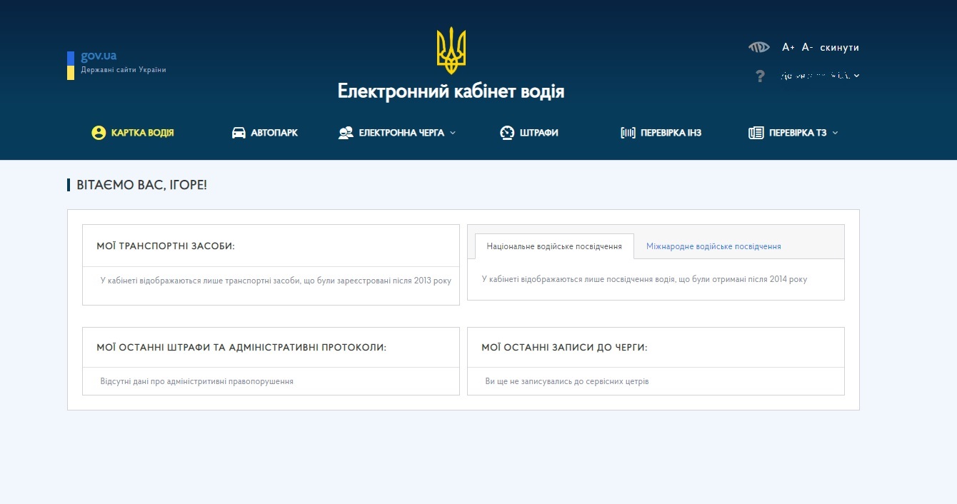 Собственно сабж. Статья по ссылке ниже. http://autonews.autoua.net/novosti/20530-v-ukraine-zarabotal-elektronnyj-kabinet-voditelya-chto-eto-takoe.html Сам кабинет находится здесь (пока работает в тестовом режиме): https://e-driver.hsc.gov.ua/ Зарегистрировался и я ради интереса. По мне информации нет т.к. авто зарегистрировано до 2013 года, а права до 2014 (это временнЫе ограничения на текущий момент, возможно дальше будут меняться). Из полезного - можно зарегистрировать телефон и мейл, на которые будут приходить сообщения о штрафах? ежели таковые будут (полезно в свете заработавших ТруКамов). Ну и проверки авто по WIN. Кроме того прямо из кабинета можно записаться в сервисный центр МВД. Внутри все выглядит как на картинке ниже. Украина все больше "цифрализуется" и это есть гуд!