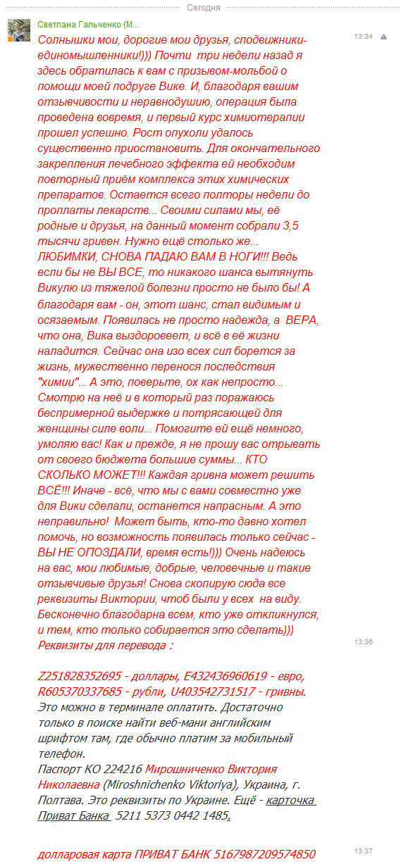 Родненькие, уже приближается закупка медикаментов на третий месяц курса химии (проплатить нужно 23-24го, и будем надеяться что это последний месяц курса). Кому сколько не напряжно - помогите МНЕ пожалуйста оплатить курс.