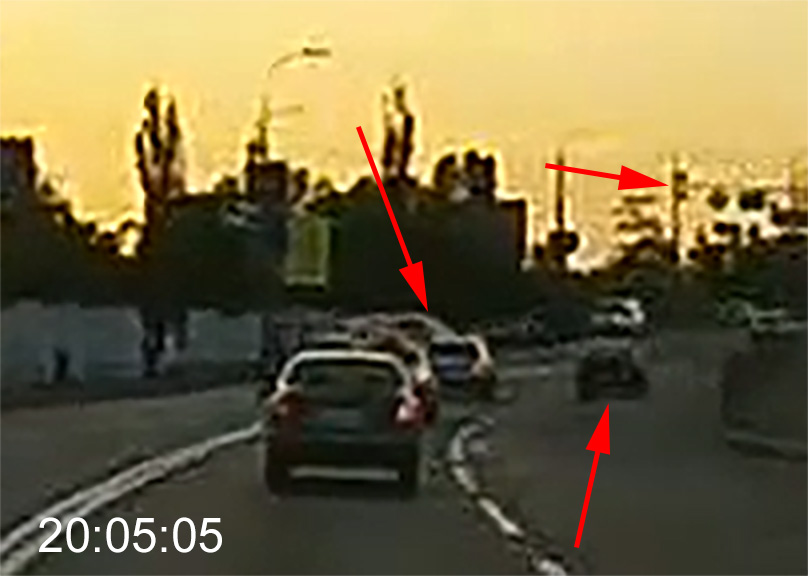 хорошо. В 20:05:08 (в момент ДТП) пыжику абсолютно точно загорелся красный. Вопрос - когда бусику загорелся желтый? Тронулся бусик где-то в 20:05:04, перед этим он стоял на перекрестке, тоже видно. Продолжительность свечения желтого 3-4 сек