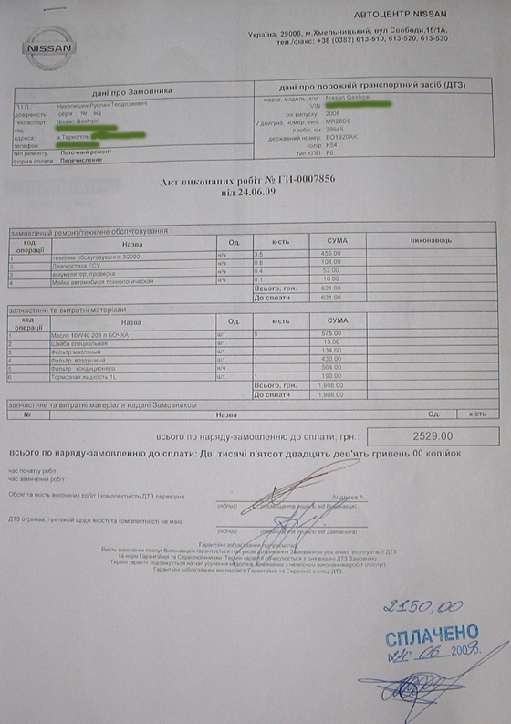 заехал сейчас на ТО-2 в Николаеве на Н-Авто, сказали стоить будет 3500грн, я им вывалил из багажника все расходники на ниссан(фирменные) большое спасибо за это Алексею с Львова,на что мне ответили узнают у шефа менять или нет,в итоге жду когда сделают,к машине неподпустили,обьяснили мол необорудованное сто под просмотр работы(в целях безопасности) сказали еще что сделают отметку в ггарантийке что привез свои расходники, для них котируются только те расходники которые куплены у официального дилера с накладной и отметкой(печатью) а все остальное типа бурда его если чего некто экспертизу делать небудет и им этот головняк ненада,мол все проблемы по гарантии будут ваши,я все это записал на диктофон,все расходники сфоткал все номера снял на видео,если че будет уменя доказательная база,ато наедут что фуфло поставил,я им прямо в лоб все покажу,впринцыпе 3часа подождем и все выясним ,плюс устранить все лажи в машине, течет бачок омывателя когда полный,дальше счелкает под машиной чтото когда сбрасываю скорость и набраю скорость и когда торможу,когда дождь задний правый стеклоподьемник невсостоянии поднять стекло-приходится рукой приподнимать,замок багажника как и увсех тарабанит,плюс ведет машину на повороте когда входишь в поворот необходимо доводить дополнительно руль в поворот,скрип стекла под торпедой,короче мама негорюй,хоть самому все перебирай,и как всегда амортики задниеособенно уже второй раз правый пасажирский задний.ну вроде все,скока ждать точно незнаю,хорошо что дома кёрхером всю вымыл и днище,чтоб им лечче искать и делать было