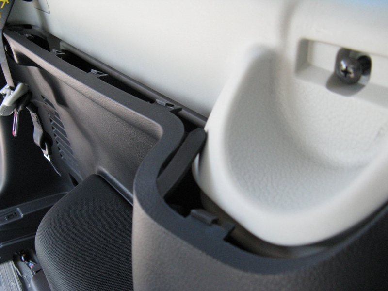 Сняв третий ряд сидений, мы принялись за боковые панели. Они у меня состоят из верхней и нижней с каждой стороны. И, в отличие от стандартного кузова, мои – полностью пластиковые. Как заметил Вадим, английские индусы постарались и закрепили их не только клипсами и защёлками, но и винтами. Один из них спрятан внутри уха для крепления сетки багажника (в кармане за колёсной аркой), второй – в ложе защёлки шторки багажника, третий – в ручке для входа на третий ряд сидений.
