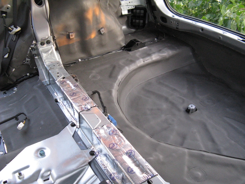 2 – стенки «кастрюли» запаски, панели над колёсными арками и крылья (огромные площади за панелями), пол над бензобаком, частично переборку (к которой крепится третий ряд сидений) и заднюю панель – Вибропластом М2.