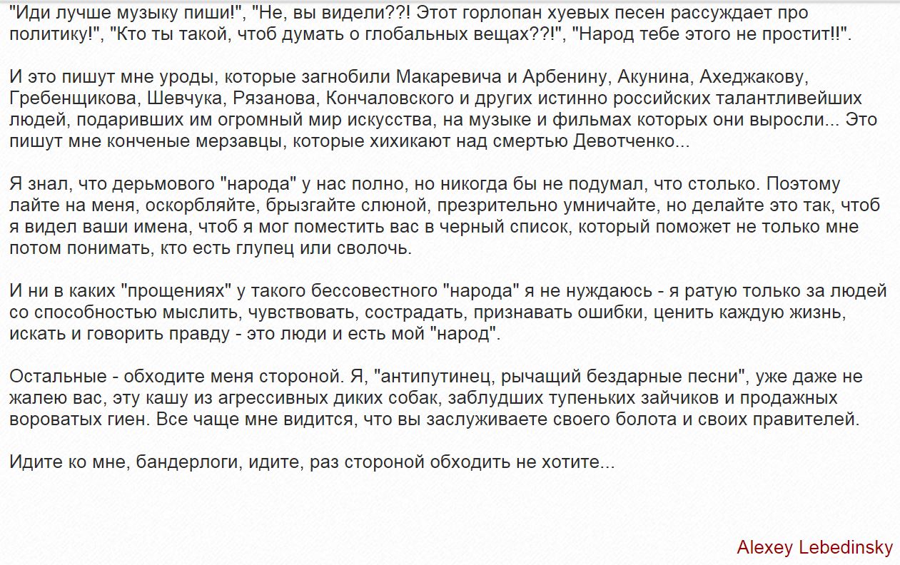 Nik А там многие просто не понимают чего натворили. Потому что и не могут понять: жизнь у них тяжелая, думать дальше начала-конца рабочего дня и чисел зарплаты-получки не привыкли, плюс росговноТВ-РАДИВКА цельный день. А еще шуфричи, ефремовы, ахметовы, ленины-сталины с предками и немцами, газвода в автомате по копейке и по три копейки сладкая ... Они верят, что всё было бы в шоколадном золоте, если бы Киев тут же с апплодисментами признал обе "народные республики" и тихонечно бы ретировался на*уй. Шоколадное золото давно было бы уже в составе раиси, продавало бы уголек Киеву по цене платины, получало бы российские пенсии в 25тыщ и в ус бы не дуло. Вот фраза из цитаты про детей - самое оно и есть!