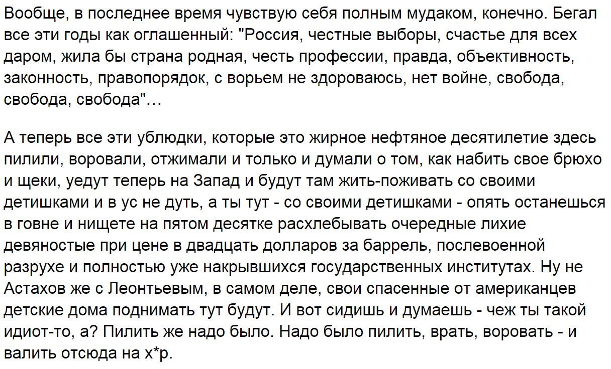 elektron писал(а):А когда они были в тепле, одеты и накормлены, тогда им было не все равно, тогда была раися, новораися, путинпамаги-введивайска, тогда они становились грудью стариков и ложились на землю перед гусеницами украинских детей, которые шли не на Донецк и Луганск, а к восточной границе за Донецк и Луганск, за них же, таких "красивых и умных", когда они голодные и холодные, когда они спят зубами к стенке ... но ведь за них же!Но ведь и не только за них - за свою, за нашу землю тоже!!!