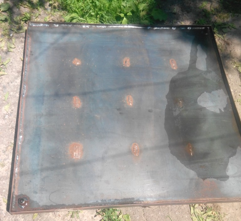 Конструкция абсорбера. Из уголка сварена рамка метр на метр. Внутрь рамки вварены два листа металла с расстоянием между ними ~5 мм. Между листами вварены стяжки для предотвращения "раздувания". По диагональным углам вварены две резьбы для подсоединения труб.Объем теплоносителя в абсорбере получился около 6 литров. Абсорбер покрасил черной краской из балончика.