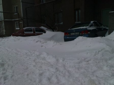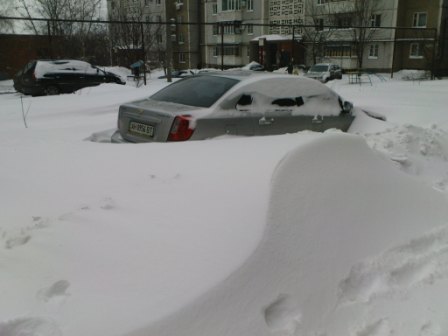 Вчера выехал утром на работу, расчистил машину и погреб. 4х4 рулит! При выезде из двора был сугроб по колено, приходилось раз десять штурмовать. Заезжаю на пузо, сдаю назад и опять с разгона. Доехал на работу практически без приключений, дороги разбиты в отличии от двором. Весь день и всю ночь шел сильный снег. Сегодня утром возвращался с работы. В свой двор уже заехать не смог. Замело по пояс. Поставил машину рядом с детской площадкой, и пошел фоткать.