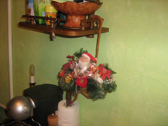 Всякие новогодние штучки на мебели в зале над телеком