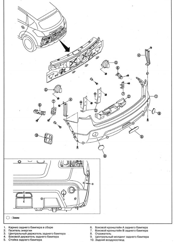 п.8 самый сложный этап, даже после разборки не знаю как произвести его лучше. Просто аккуратно оттягивать бампер от кузова и одновременно толкать вперед. На кузове у нас 4 белых боковых кронштейнов (номер 6 и 7 на рис 1), по две с каждой стороны, с двумя зубами на каждой: