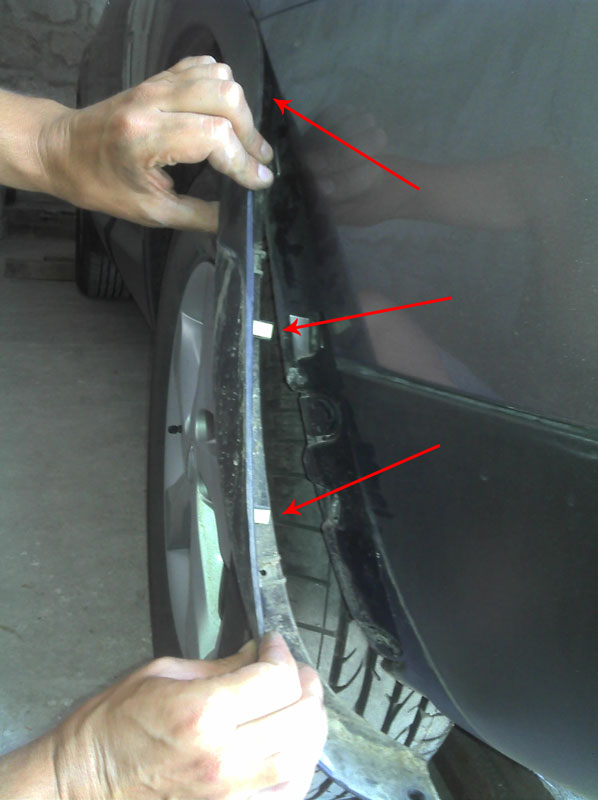 выскакивают защелки достаточно легко. Полностью его снимать не нужно, достаточно только защелки входящие в пластик. В металле заднего крыла стоят защелки совершенно другой конструкции которые достаются гораздо хуже, так что лучше их не трогать совсем