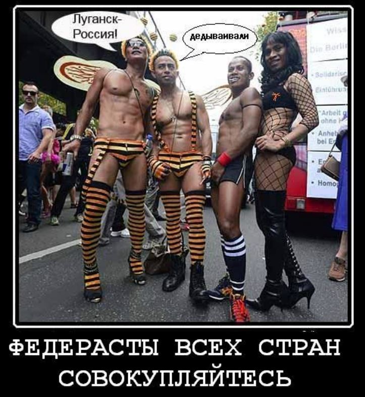 ВСЕ КТО ЗА РУССКИЙ ДОНБАС ВЫХОДИТЕ НА УЛИЦУ ПОДДЕРЖАТЬ СВОИХ ! ВОЗЬМИТЕ ЕЩЕ СТРАПОНЫ МОГУТ ПРИГОДИТЬСЯ КОГДА ВАС ПОЙМАЮТ- НА ГОЛОВУ ОДЕНЬТЕ ГАНДОНЫ, В ЖОПУ ЗАСУНЬТЕ РУССКИЕ ФЛАГИ И НА ШЕИ НАМОТАЙТЕ ГЕОРГИЕВСКИЕ ЛЕНТОЧКИ. ДА ..И НАМАЖТЕСЬ ГОВНОМ ,НО ТОЛЬКО РОССИЙСКИМ И ВОЗЬМИТЕ БЕЛЫЕ ПРОСТЫНИ,ЧТОБ ВАС ПОТОМ НАКРЫТЬ МОЖНО БЫЛО...БЫДЛО КРЫСИНОЕ