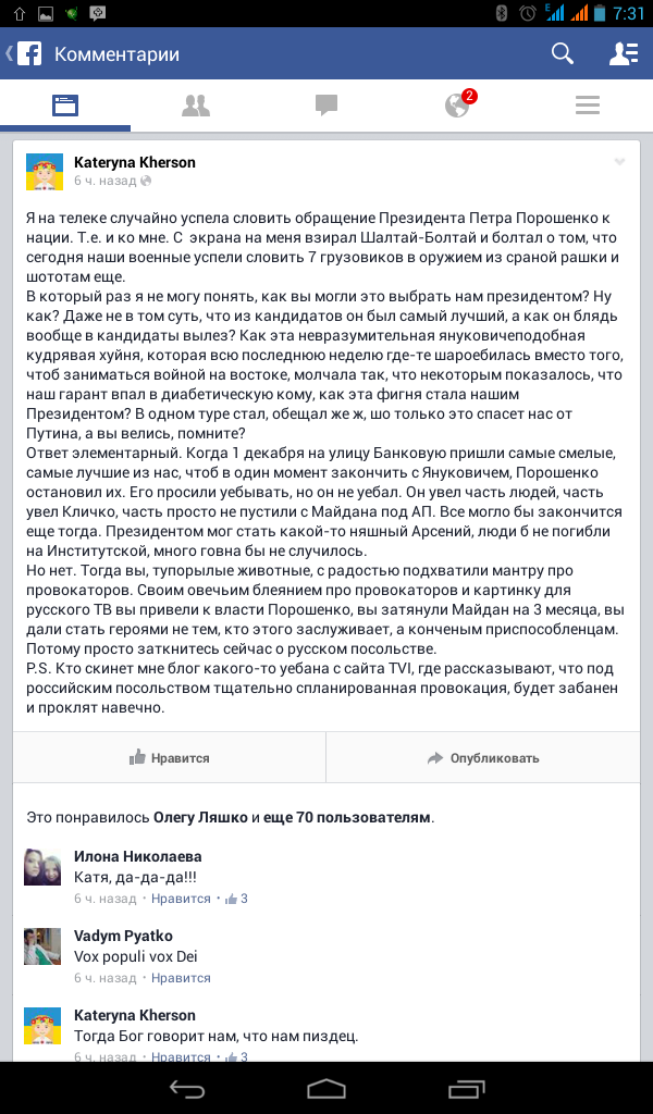 kazantip смотри на мысль - тебя избрали презом с инагурации прошло чуть больше недели ты пришел руководить страной которая 23! ебаных года разворовывалась так что только ветер свистел особенно в последние годы. В стране идет ВОЙНА! В стране коррупция и целые кланы сидят на руководящих должностях и тихесенько смокчут все соки из Украины и ее жителей. И тут ты еще даже жопу в кресло не примостил а тебе уже кричат вали кучерявый урод ты ни хрена не сделал неделя прошла а мы ничего не увидели. за неделю даже начать войну невозможно а уж тем более остановить. Я не защищаю пороха и не питаю иллюзий что он кристально честный. Но я также ни питаю иллюзий что в этом бардаке что то можно сделать за неделю. Критиковать легко. Скажи что бы ты сделал за неделю? вот дали тебе страной порулить. много успеешь?