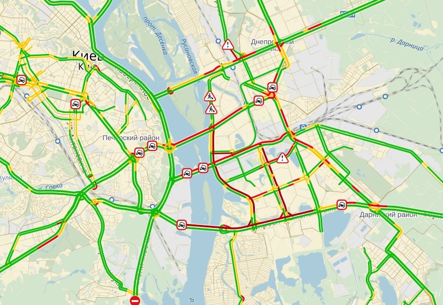 На дарницком мосту два похоже друг друга притерли, а потом разьехались, заняли два с половиной ряда. И в конце моста в левом ряду стоял кто-то на аварийке. Мост переехал за минут 30-40. Ну и само собой до моста 1-2 дополнительных ряда олени организовали.