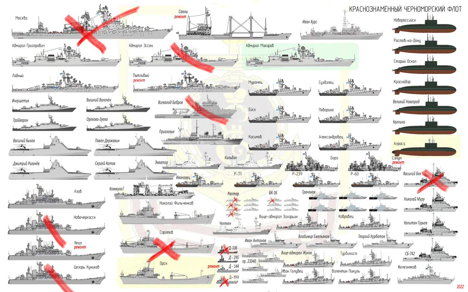 Потоплено: Крейсер "Москва" Великий буксир "Васілій Бех" Малий десантний катер "Д-199" Швидкісні бронекатери "Раптор" - 3 штуки Швидкісний бронекатер "БК-16"