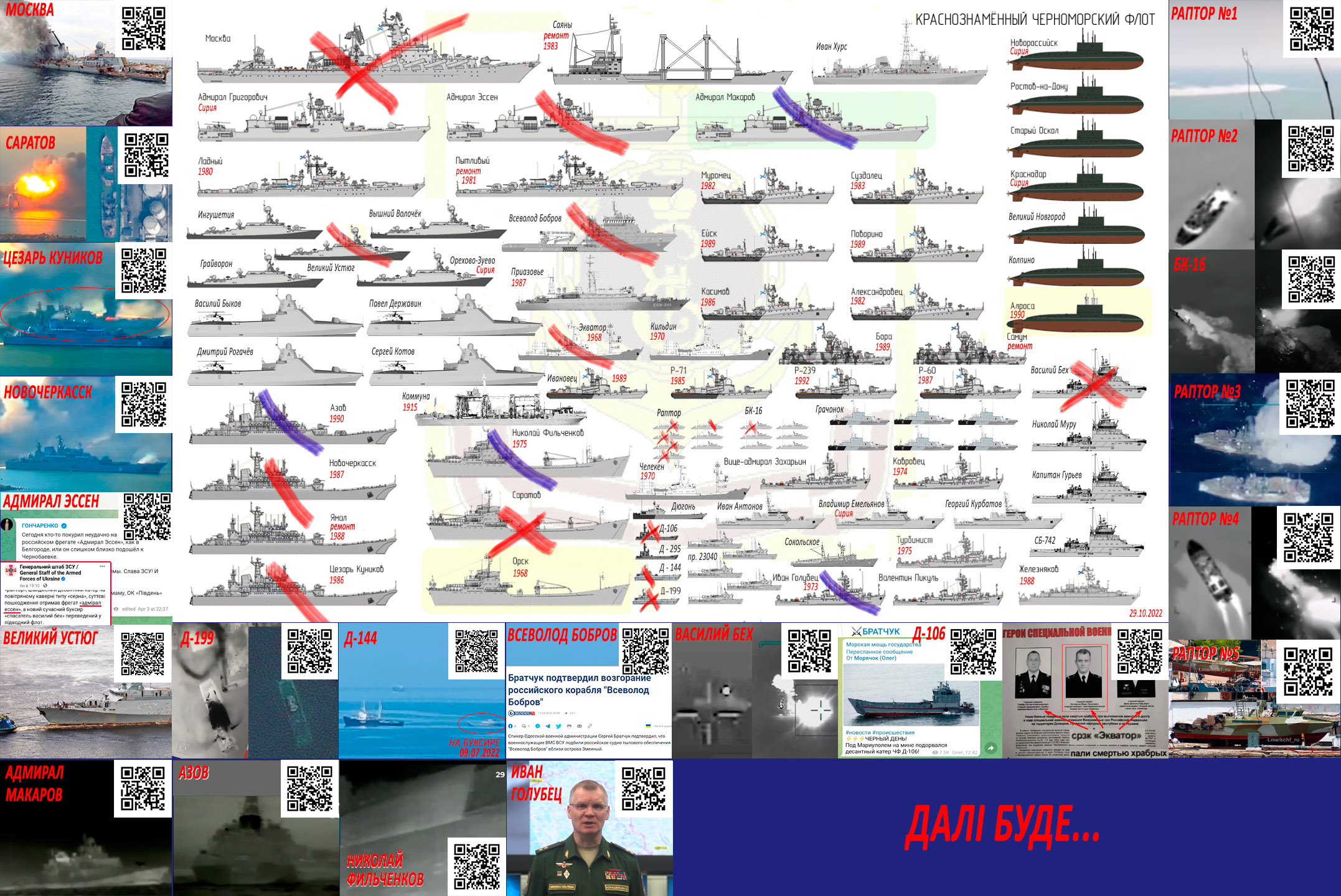 Серед БДК проекту 775 Куніков і Новочеркаськ - це ті самі бідолаги, які з пожежами на борту, дохлим капітаном та деякими матросами ледь здриснули з порту Бердянська у момент розриву на шматки БДК "Саратов". Оновив свою картинку. Поки нема точних назв - влучання в кораблі позначив синім. Хоча, сумнівів про Голубця і Макарова нема.