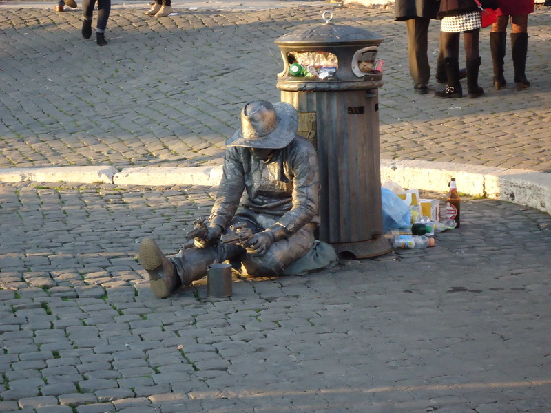 Первое, что мы увидели при выходе из автобуса это толпы афроамериканцев, втюхивающих нам "амбрелла", зонты, а также дождевики, шарфы, перчатки и прочие необходимые при данной погоде вещи. Наверное, надо на пару секунд задержать свое внимание на них. Их много везде. В основном, они стоят со скатертями-самобранками. Это такие простыни, в углах которых продета веревка. На такой простыне расставлен товар, преимущественно сумки. При виде полиции, они тянут за шнурок, простынь стягивается, вместе с товаром, и торговец имеет шанс удрать. Кстати, в общественных местах висят предупреждения о штрафе размером 200 ЕВРО за покупки у таких торговцев. "Это способствует нелегальной торговле и отмыванию средств".