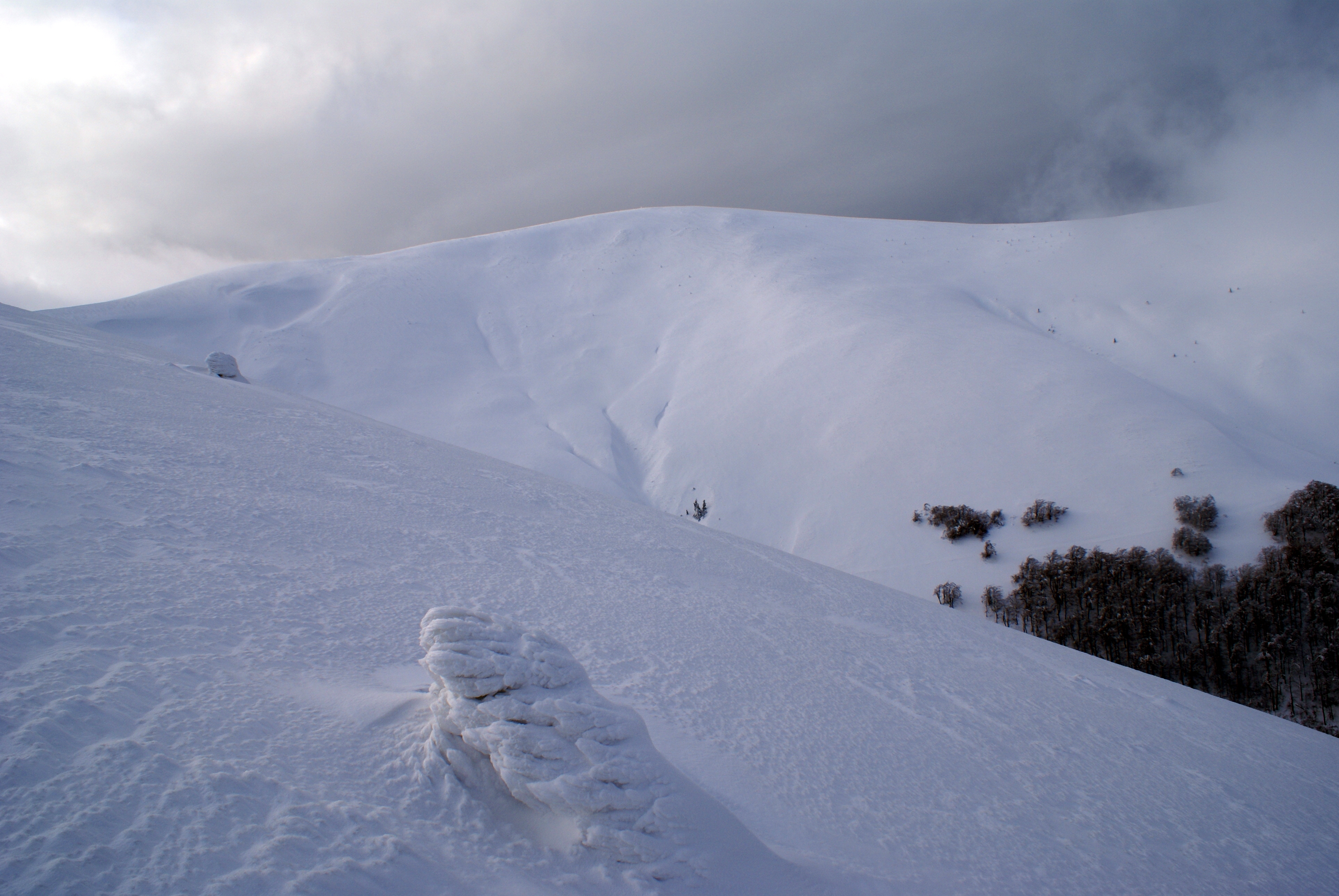 Судячи з того, що поруч, з-під снігу стирчат лише снігові горбики над верхівками криволісових смерек, які не дуже то й низькі тут, річ іде не про сантиметри і не про десятки.