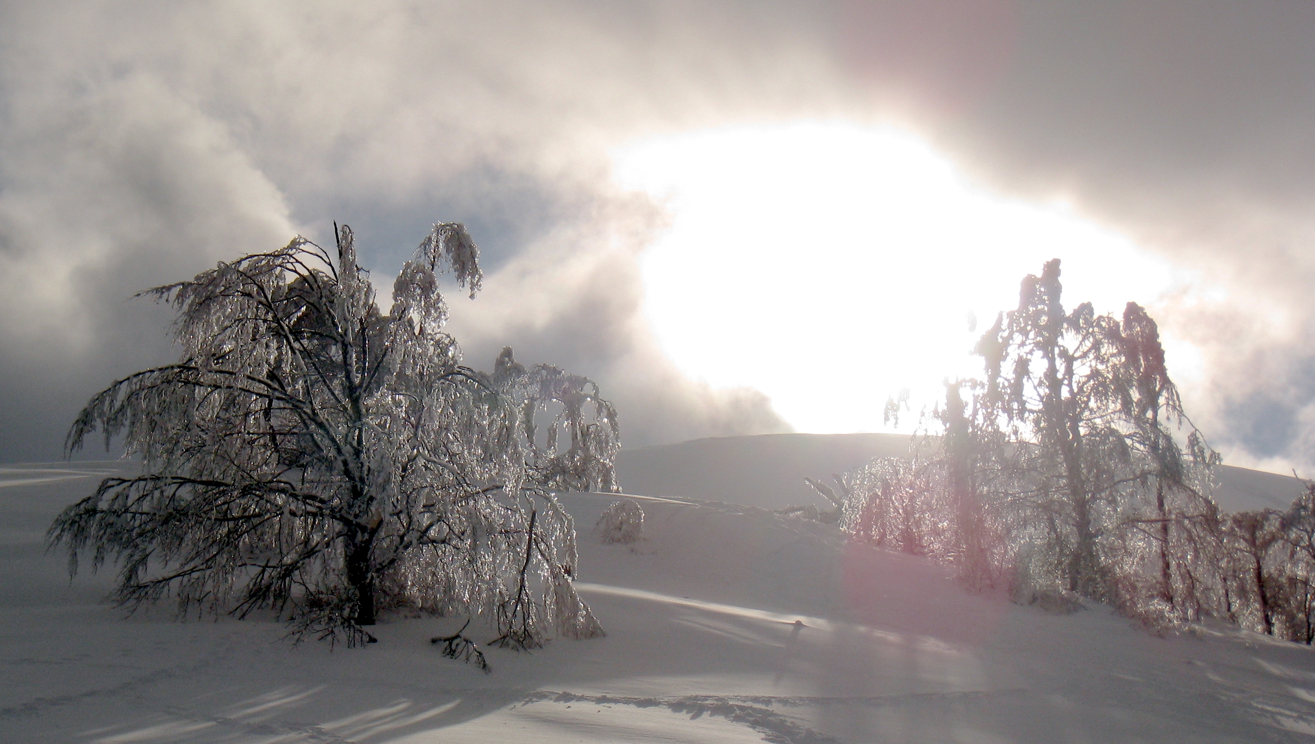 Йдемо цілиною. В лісі сніг м'який, провалюється. Передній потихеньку "топче" доріжку, благо у снігоступах йдеш, неначе по грунту, ноги пірнають у сніг не вище колін. До речі, одного разу вирішив у ботинках сходити "до вітру" під ялинку – провалився майже з головою – під гілками снігу мало того, що багато, так він ще й не влежаний. Правда було це на Північному Уралі, але то вже не важливо