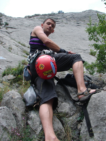 Понедельник (13.07) ознаменовался для меня и Леши покорением 220 метрового скалолазного маршрута. Лезли мы 4 часа. Сказать что было очень сложно – не могу… Скорее просто изнурительно. Плюс ко всему жарило солнце, о чем потом долго напоминали зудящие плечи и шея. Самое большое удовольствие – это момент, когда ты пролазишь последние несколько метров и, перевалившись через очередной отвес, оказываешься на самой вершине… Удовольствие и красота – неописуемые.
