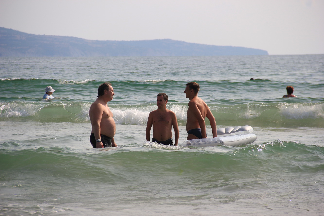 С утра на пляж, детворе нравится кататься на больших волнах. К обеду спасатели выставили желтые флаги - купаться можно, но с повышенным вниманием. Днем Женя с Даней поехали в