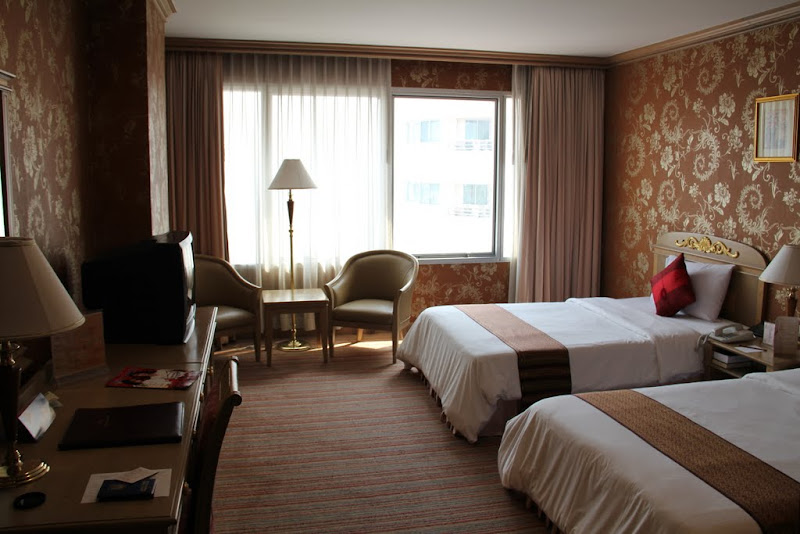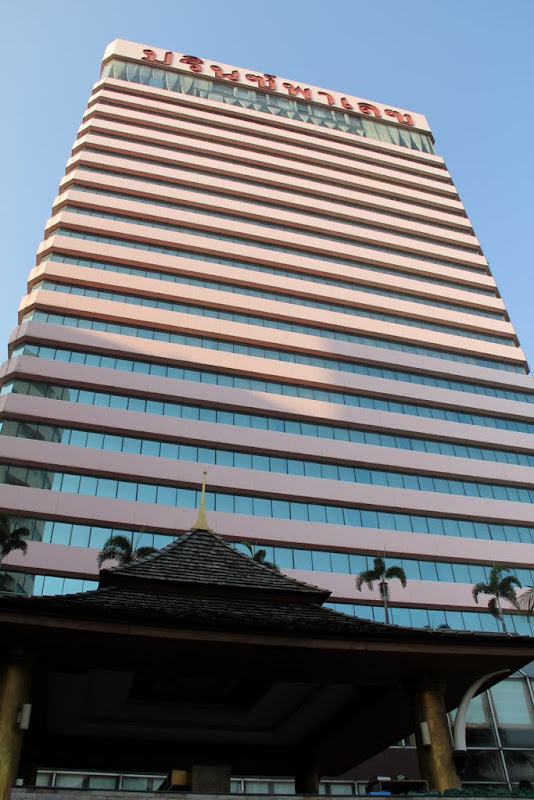 В Бангкоке мы были две ночи, жили в отеле Prince Palace. Отель состоит из 4х башен по 32 этажа, но до 11го этажа это одно цельное огромное здание, с 1го по 5й (могу ошибаться) оптовый шмоточный рынок, потом паркинг, а с 11го этажа начинается собственно отель. На 11м этаже находится лобби, между башнями - бассейны, сад и бар, так же на 11-12 этажах есть еще рестораны, конференц залы и прочее. Мы жили на 23-м этаже в основной башне. Номер совершенно обычный, вполне нормальный.