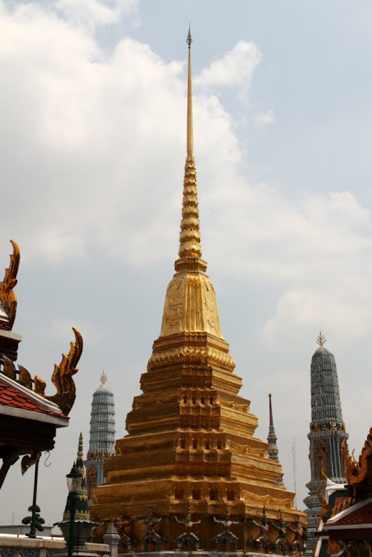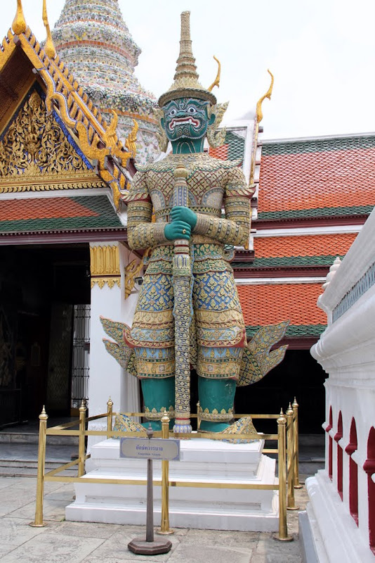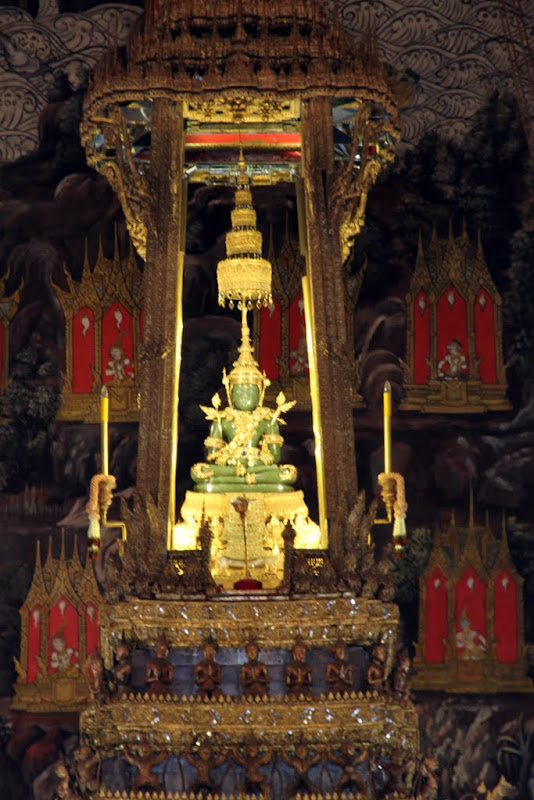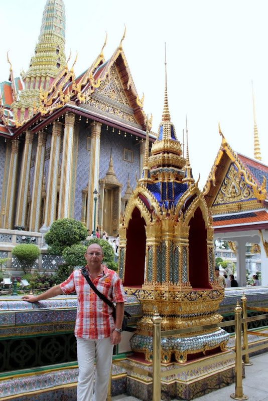 Во дворце очень красиво (и очень жарко). Сначала ведут к храму Изумрудного Будды, там разуваетесь и заходите в храм. Желающие могут помедитировать сидя на полу. Медитирующие монахи почему-то отделены от туристов веревочкой. После рассказов гида (была тайка сносно говорящая на русском) предоставляется свободное время. Мы пошли фотографировать и осматривать все подряд. Т.к. внутри храма Изумрудного Будды фотографировать нельзя, то пришлось фотать его через окно (это можно), благо зум позволил худо-бедно сфотать эту небольшую статуэтку.