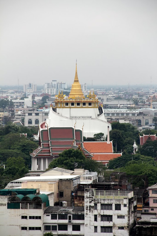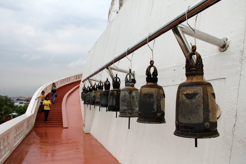 На третий день в Бангкоке нас должны были забирать в 15:45 и везти в аэропорт, поэтому были планы позагорать, побродить по окрестностям, но им не суждено было сбыться, т.к. с ночи шел дождь. Пока мы завтракали дождь закончился и, встреченный на ресепшне гид Алекс, порекомендовал посетить храм Wat Saket Ratcha Wora Maha Wihan он же Golden Mount, до которого всего одна лодочная остановка. Отдав багаж на ресепшне и получив вместо него карточку, сели в лодку и поехали к храму. После ливня было не очень жарко, но ужасно влажно, все кругом мокрое, лужи, с деревьев капает, с меня течет....