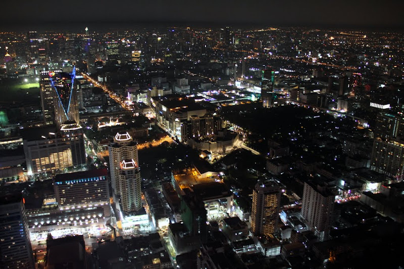 Возле Байка мы встретились с туристами из нашего отеля и гидом. Гидом оказалось нечто трансвеститско-гейское, с мужским голосом, длинными волосами, женским лицом и сиськами... и жуткой, я бы сказал даже утрированной, гейской походкой. Поднявшись на лифте на 77й этаж и побродив по музею, поднялись на другом лифте в ресторан. Мы были дюже уставшие после Королевского дворца и последующей поездки в Siam Paragon, так что быстро поели и пошли на вращающуюся площадку наслаждаться видом ночного города.