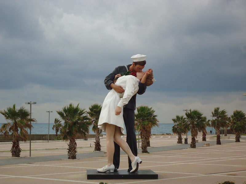 На утро, 2 января, нам предстояло отправиться с вокзала на электричке в порт, откуда начинался наш круиз. Билеты стоили 5 Евро, их нужно было закомпостировать на перроне в автомате, и отправиться в путь. Нам помогли погрузиться в вагон, сложить чемоданы в одном месте, попросили за это денежку, и мы довольные поехали. Шампанское способствовало переходу настроения из отличного в супер-отличное. Электричка ехала быстро, максимальная скорость, которая отобразилась на табло 153 км\ч. Доехали за час. Порт Чивитавекия встретил нас красивой набережной с обалденным памятником. Потом была погрузка на судно. И путешествие продолжилось.