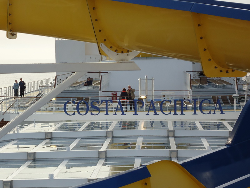 По многочисленным просьбам расскажу, точнее покажу, подробнее наше судно. Судно Costa Pacifica принадлежит итальянской компании Costa. Судно называют музыкальным. Это хорошо видно по оформлению, а мы еще и ощущали живьем в многочисленных салонах, барах, ресторанах и пр. Но, мы, поневоле, сравнивали его с судном Vision of the Seas, принадлежащем Роял Карибиен, на котором мы ходили на фьорды. Сosta больше, вмещает большее количество пассажиров, у нас были каюты лучше, чем на Роялах, но сервис значительно отличался. Не подумайте, что было плохо! Просто по-другому. Дело все в организации и общей политике компании. При путешествии по фьордам мы, пассажиры, садились все в Копенгагене, шли в круиз, и сходили в Копенгагене. В теперешней поездке, в каждом порту кто-то входил-выходил, люди менялись, и по вечерам и утрам нас не покидало ощущение вокзала. А кроме того, для вновь прибывших, каждый вечер, в 16.30 проводилась обязательная учебная тревога, которая тоже немного напрягала. Если вкратце, это как сравнивать элитные авиалинии и wiss air. И там, и там летишь. И там, и там обслуживают. Но, есть нюансы. В любом случае, порты остановок были такими желанными и интересными, а компания теплой, душевной и приятной, что впечатления не испорчены. Также хочу заметить, что привлекательной была и цена поездки. Интересующимся подробностями информацию о судне можно прочесть в википедии, я же покажу любительские фото, предоставленные Владом. Практически все фото моего отчета принадлежат ему, и мы ему очень благодарны за это. Он снимал всегда, везде, и в дождь, и в ураганный ветер.